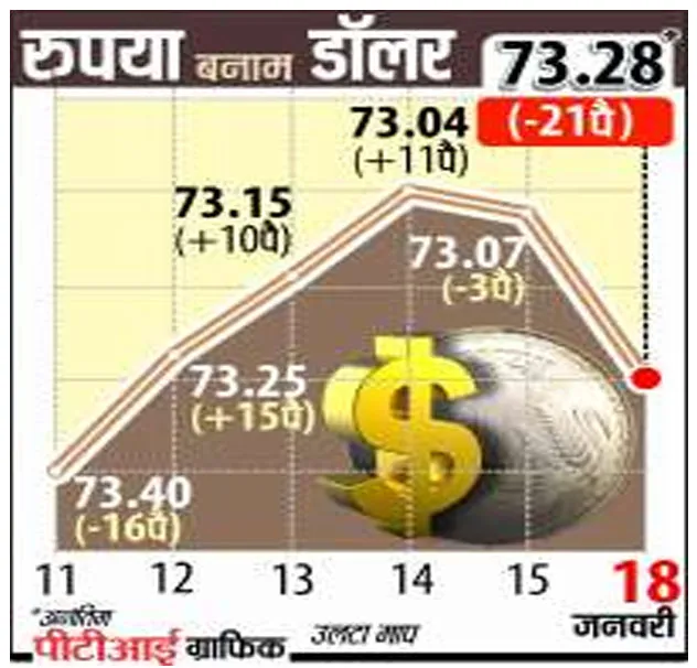 नई दिल्ली। अमेरिकी डॉलर में मजबूती तथा घरेलू शेयर बाजारों में नरमी के बीच सोमवार को रुपये में गिरावट दर्ज की गयी और यह एक सप्ताह के निचले स्तर पर आ गया। अंतरबैंकिंग मुद्रा विनिमय बाजार में रुपया 21 पैसे नरम होकर 73.28 प्रति डॉलर पर बंद हुआ। आज के कारोबार में रुपया 73.21 प्रति डॉलर पर खुला। कारोबार के दौरान यह 73.30 प्रति डॉलर के दिन के निचले स्तर और 73.18 प्रति डॉलर के दिन के उच्चतम स्तर के दायरे में रहा। कारोबार के अंत में घरेलू करंसी पिछले दिन के मुकाबले 21 पैसे गिरकर 73.28 प्रति डॉलर पर बंद हुई। पिछले कारोबारी सत्र यानि शुक्रवार को रुपया 73.07 प्रति डॉलर पर बंद हुआ था। इस बीच छह प्रमुख अंतरराष्ट्रीय मुद्राओं के बास्केट में डॉलर का सूचकांक 0.15 प्रतिशत बढ़कर 90.91 पर आ गया।