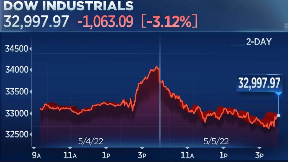 अमेरिकी केंद्रीय बैंक फेडरल रिजर्व द्वारा 22 साल बाद अपनी ब्याज दरों में 0.50 फीसदी की बड़ी बढ़ोतरी की है। इससे गुरुवार को अमेरिकी शेयर बाजार में बड़ी गिरावट आई। अमेरिका के तीनों प्रमुख स्टॉक एक्सचेंज में गुरुवार को बड़ी बिकवाली देखने को मिली। Dow Jones 1,063.09 अंक (3.12%), Nasdaq 647.165 अंक (4.99%) और S&P500 पर 153.3 अंक (3.56%) टूट गया। अमेरिकी बाजार का असर यूरोप समेत दुनियाभर के प्रमुख बाजार पर देखने को मिल रहा है। सभी स्टॉक एक्सचेंज में बिकवाली हावी है। यह दुनियाभार के बाजार का सेंटिमेंट खराब करने का काम करेगा।