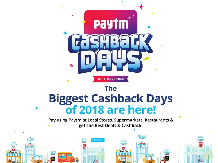 यह एक ऐसी पहल है जिसमें यूजर्स को हर छोटी-मोटी चीज से लेकर बड़े से बड़े प्रोडक्ट और सर्विस पर 15 से लेकर 20 प्रतिशत तक का कैशबैक दिया जा रहा है। इतना ही नहीं पेटीएम विभिन्न उत्पादों पर 70 प्रतिशत तक का डिस्काउंट और अन्य आकर्षक ऑफर की भी पेशकश कर रहा है। पेटीएम पर पेटीएम कैशबैक डेज सेल 12 दिसंबर से शुरू हो चुकी है और यह 16 दिसंबर रात 12 बजे तक चलेगी।