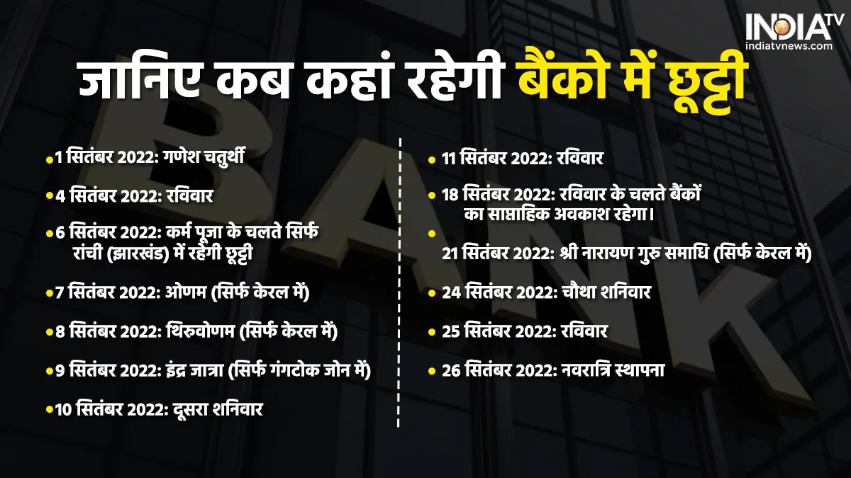 - 18 सितंबर 2022: रविवार के चलते बैंकों का साप्ताहिक अवकाश रहेगा।