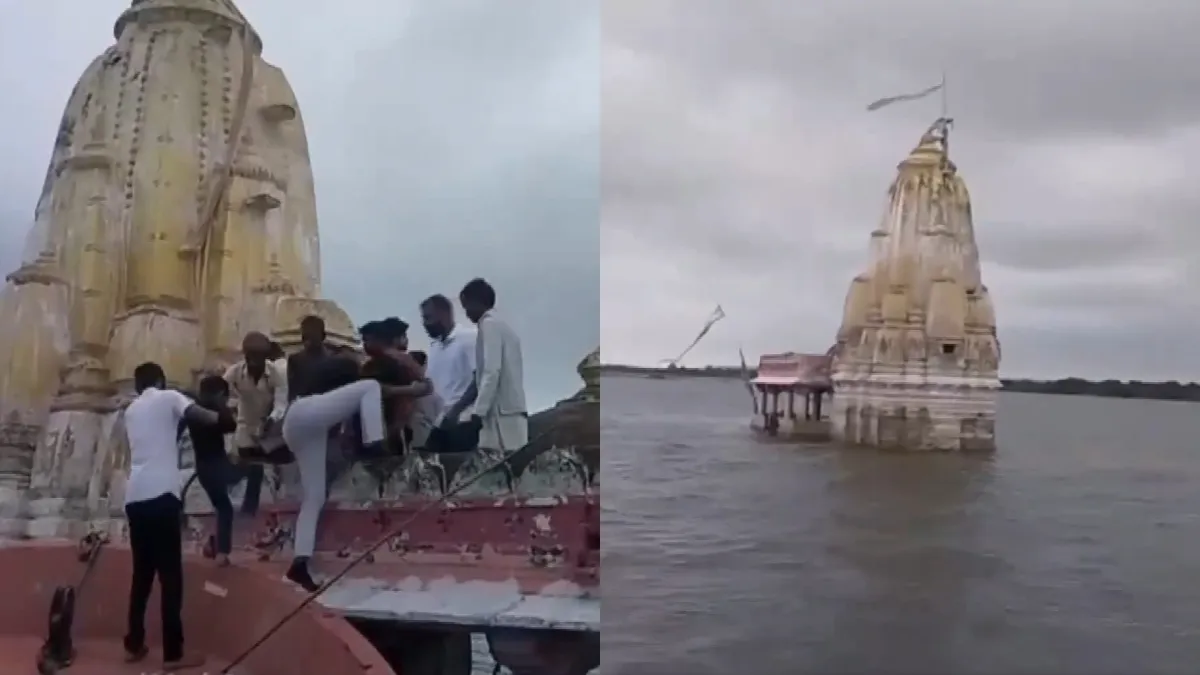 सोमवार के दिन भक्त नाव में सवार होकर आरती करने पहुंचे। मंदिर की छत पर भक्तों ने आरती की। इसके वीडियो भी सामने आए हैं, जिनमें महादेव का मंदिर चारो तरफ से पानी से घिरा नजर आ रहा है।