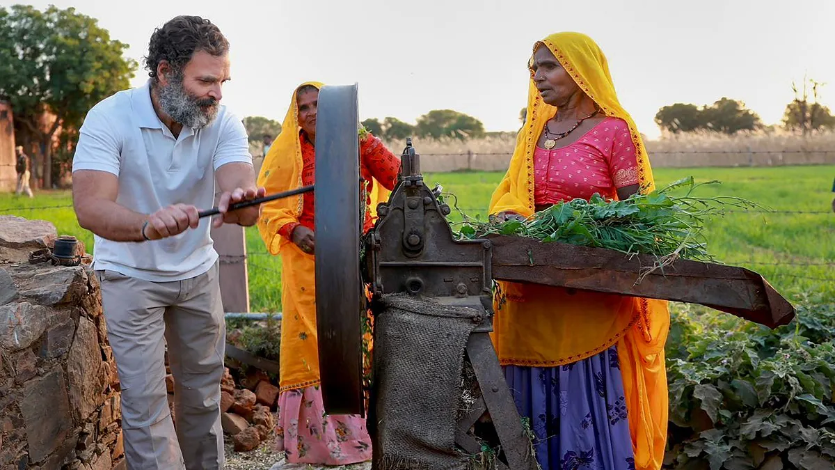 Image Source : ptiचारा काटते हुए राहुल गांधी और अशोक गहलोत