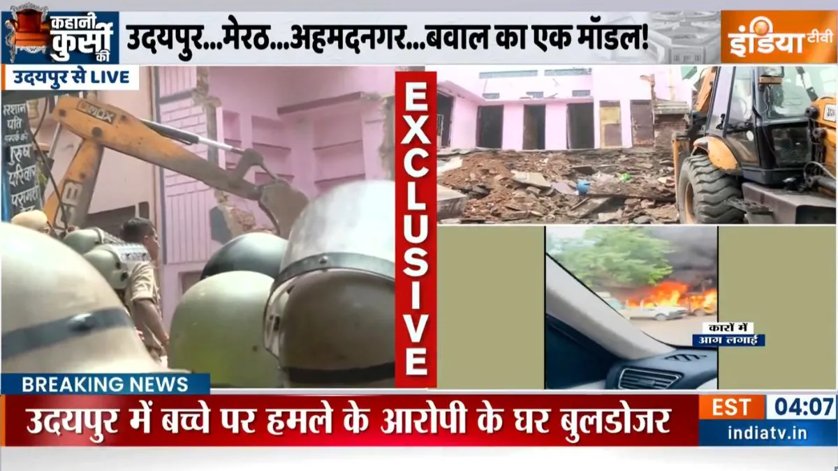 उदयपुर: जिले में शुक्रवार को एक स्कूली छात्र पर चाकू से हमला किए जाने के बाद हालात बेकाबू हो गए। शहर के कई इलाकों में तोड़फोड़ और आगजनी की घटनाएं देखने को मिलीं। हालात पर काबू पाने के लिए जहां इंटरनेट सेवाओं को बंद करना पड़ा, वहीं धारा 144 भी लागू कर दी गई। इसके अलावा जयपुर से अतिरिक्त फोर्स भी बुलानी पड़ी। वहीं घटना के अगले ही दिन शनिवार को चाकू से हमला करने वाले आरोपी के घर पर बुलडोजर की कार्रवाई की गई। शनिवार को ही आरोपी के घर पर नोटिस चस्पा की गई और फिर थोड़ी ही देर में घर पर बुलडोजर चला दिया गया।