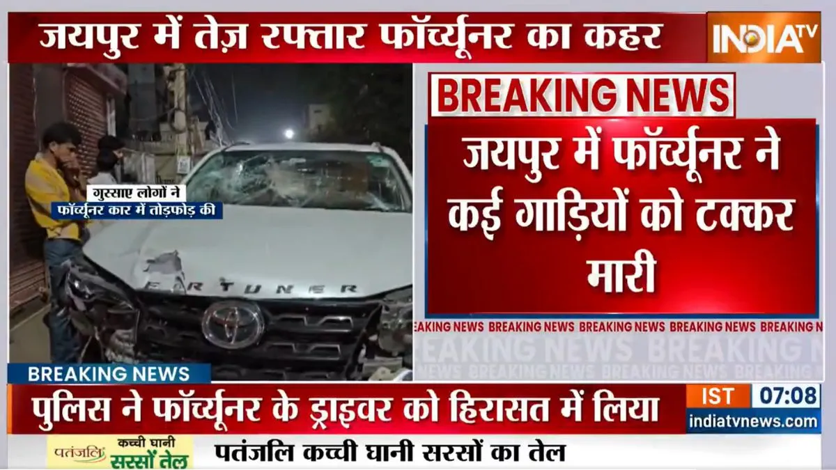 जयपुर: राजस्थान की राजधानी जयपुर में सोमवार की रात एक फॉर्च्यूनर कार का आतंक देखने को मिला। यहां आजाद नगर इलाके के टोंक रोड पर एक तेज रफ्तार फॉर्च्यूनर कार ने एक के बाद एक करके कई गाड़ियों को टक्कर मार दी। इस दौरान उसने कई गाड़ियों पर अपनी कार चढ़ा दी। घटना के बाद वह भागने की फिराक में था, लेकिन कार के आगे बाइक फंस जाने की वजह से वह भाग नहीं सका। इस दौरान वहां मौजूद स्थानीय लोगों ने कार चालक की पिटाई कर दी। इसके अलावा लोगों ने कार में तोड़फोड़ भी कर दी। हालांकि पुलिस ने भीड़ को शांत कराया। फिलहाल ड्राइवर को पुलिस ने हिरासत में ले लिया है।