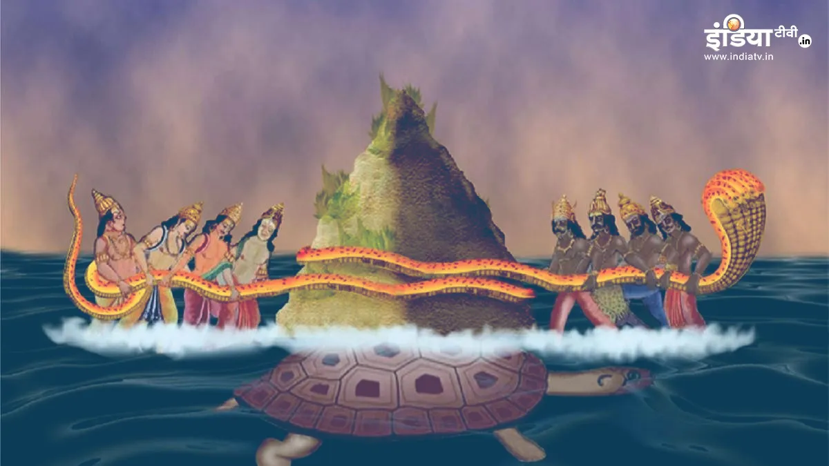 इसके बाद देवताओं जैसे-तैसे असुरों को मनाया और फिर भगवान विष्णु ने वासुकी नाग को मथनी (रस्सी ) बनने को कहा। साथ वे स्वयं कछुए का रूप लेकर मंदराचल पर्वत को अपनी पीठ पर रखा। फिर सुमुद्र मंथन शुरू हुआ। कहा जाता है कि ये समुद्र मंथन कई युगों तक चला। विष्णु पुराण के मुताबिक समुद्र मंथन में कुल 14 रत्न निकले।