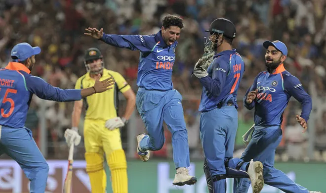 33वें ओवर की चौथी गेंद पर कुलदीप का सामना उतरे कमिंस। कुलदीप के लिए हैट्रिक चांस। कुलदीप की गुगली को कमिंस ने रक्षात्मक तरीके से खेलने की कोशिश की। गेंद बल्ले का बाहरी किनारा लेती हुई सीधे विकेटकीपर एमएस धोनी की ग्लब्स में चली गई। कुलदीप ने अपना पहला हैट्रिक लिया।
