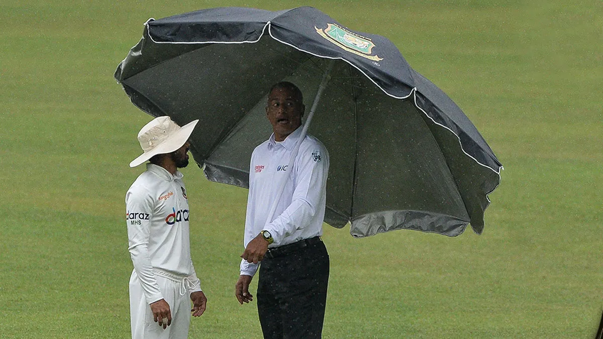 ढाका। पाकिस्तान और बांग्लादेश के बीच खेले जा रहे दूसरे टेस्ट मैच के दूसरे दिन का खेल भी बारिश और खराब रोशनी से प्रभावित रहा और रविवार को सिर्फ 38 गेंद का खेल संभव हो सका। बारिश के कारण पहला सत्र पूरी तरह से धुल गया । स्थानीय समय के मुताबिक दोपहर 12 बजकर 50 मिनट पर दिन का खेल शुरू हुआ लेकिन अभी 6.2 ओवर ही फेंके गये थे की बारिश ने फिर से मैच में खलल डाल दिया और इसके बाद खेल शुरु नहीं हो सका।