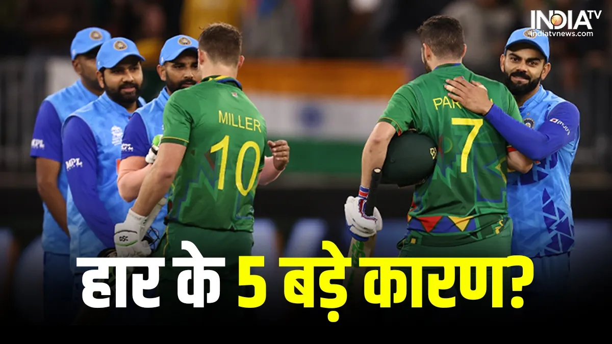 IND vs SA: भारतीय टीम को साउथ अफ्रीका के खिलाफ टी20 वर्ल्ड कप 2022 की पहली हार झेलनी पड़ी। सुपर 12 में लगातार दो जीत के बाद मिली यह हार टीम इंडिया के लिए एक आई ओपनर यानी आंखें खोलने वाली है। इस मैच में भारतीय बल्लेबाज (सूर्यकुमार यादव को छोड़कर) पूरी तरह फ्लॉप साबित हुए। वहीं फील्डर्स ने भी कई आसान मौके गंवाकर मैच गंवा दिया। गेंदबाजों ने भरपूर कोशिश की लेकिन बीच के ओवरों में हार्दिक और अश्विन ने कुछ रन भी खाए। ऐसे कई बड़े कारण रहे जिनके कारण टीम इंडिया को प्रोटियाज से करारी हार झेलनी पड़ी।
