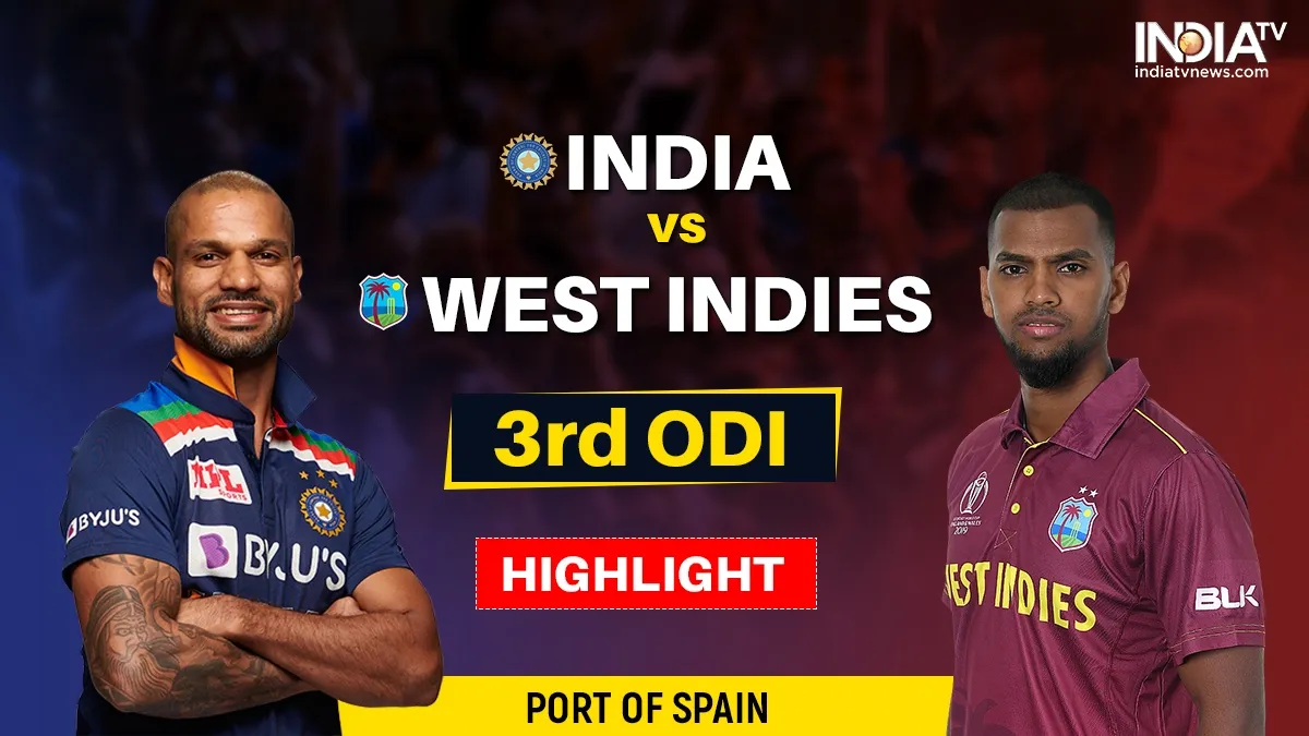 IND vs WI (INDIA vs WEST INDIES) 3rd ODI HIGHLIGHTS: भारत ने वेस्टइंडीज के खिलाफ बारिश से प्रभावित तीसरा वनडे 119 रनों से जीत लिया। शिखर धवन की अगुआई में टीम इंडिया ने वेस्टइंडीज के खिलाफ तीन मैचों की वनडे सीरीज को क्लीन स्वीप किया और कैरेबियाई टीम के खिलाफ लगातार 12वीं सीरीज जीतने में सफल रही। पोर्ट ऑफ स्पेन में खेले गए मुकाबले में भारत ने टॉस जीतकर पहले बल्लेबाजी करने का फैसला किया और बारिश से बाधित मैच में शुभमन गिल के 98 रन की नाबाद पारी के दम पर 36 ओवर में तीन विकेट खोकर 225 रन बनाए। इसके बाद बारिश के खलल के कारण मैच के ओवरों में कटौती की गई और वेस्टइंडीज के सामने जीत के लिए 35 ओवरों में 257 रन का लक्ष्य रखा गया। जवाब में वेस्टइंडीज की पूरी टीम 26 ओवर में 137 रन पर सिमट गई। भारत की तरफ से युजवेंद्र चहल ने सर्वाधिक चार विकेट झटके तो वहीं शार्दुल और सिराज को दो-दो विकेट मिले।