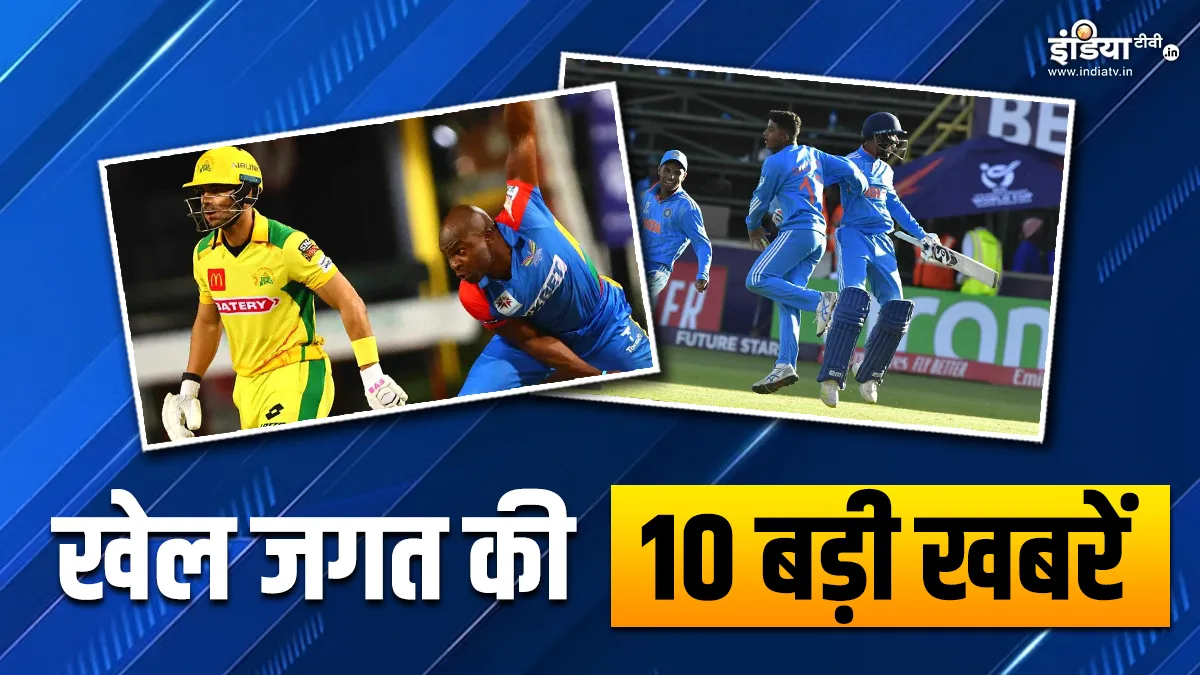 Sports Top 10 News: अंडर 19 वर्ल्ड कप का फाइनल मैच भारत और ऑस्ट्रेलिया के बीच खेला जाएगा। ऑस्ट्रेलिया ने अपने सेमीफाइनल मैच में पाकिस्तान को हराया। दूसरी ओर SA20 लीग के दूसरे क्वालीफायर मैच में जोबर्ग सुपर किंग्स को हार का सामना करना पड़ा है। इस हार के साथ ही उनकी टीम टूर्नामेंट से बाहर हो गई है। ऑस्ट्रेलिया ने भी अपने न्यूजीलैंड के खिलाफ टेस्ट सीरीज के लिए अपने स्क्वाड का ऐलान कर दिया है। ऐसे में आइए खेल जगत की 10 बड़ी खबरों पर एक साथ नजर डालते हैं।