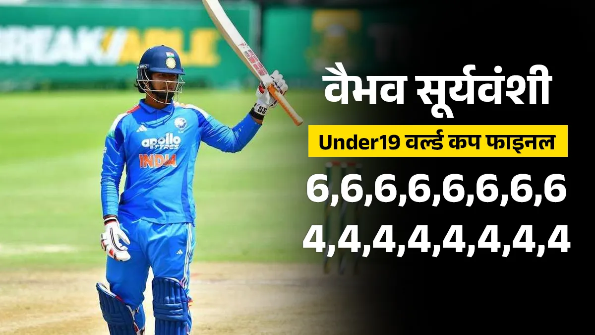 वैभव सूर्यवंशी ने अंडर 19 वर्ल्ड कप में एक और धमाका किया है। वैभव ने फाइनल मुकाबले में इंग्लैंड के खिलाफ विस्फोटक अंदाज में शतक लगाने का काम किया है। इस दौरान उन्होंने आठ चौके और आठ छक्के लगाए।