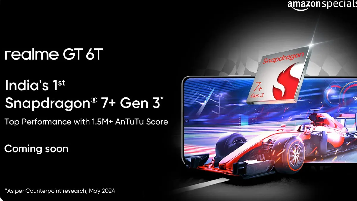 Realme GT Series का तगड़ा फोन जल्द भारत में लॉन्च होगा। कंपनी ने अपने इस फोन को आधिकारिक तौर पर टीज किया है। इसके अलावा इस फोन को ई-कॉमर्स वेबसाइट Amazon पर भी लिस्ट किया गया है। रियलमी के फाउंडर और CEO स्काई ली ने हाल ही में अपने GT सीरीज के नए फोन के लॉन्चिंग कंफर्म की थी। रियलमी का यह स्मार्टफोन Realme GT 6T के नाम से लॉन्च होगा। यह भारत में Qualcomm Snapdragon 7+ Gen 3 प्रोसेसर के साथ आने वाला पहला स्मार्टफोन होगा।