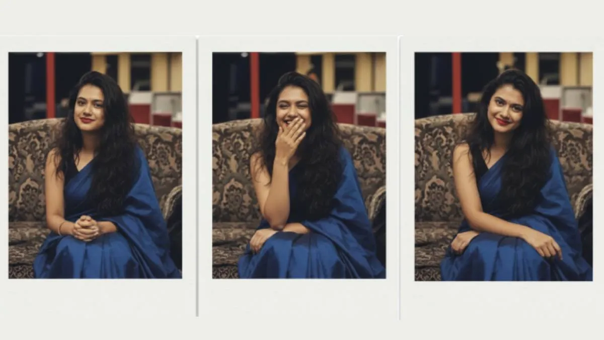 Prompt 1: 'Don't change the face 4 polaroid style protraits, white frames, retro film look. Blue saree, red lipstick, messy wavyhair, candid poses, shy smiles, playful laughter, sitting on a couch.'