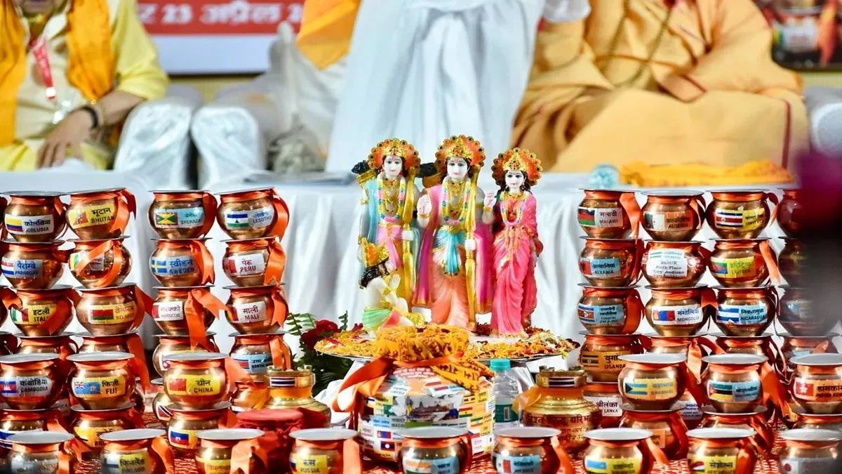 दुनिया भर के सात महाद्वीपों की 155 नदियों से लाया गया जल रविवार दोपहर अयोध्या के राम मंदिर में जलाभिषेक के जरिए अर्पित किया गया।