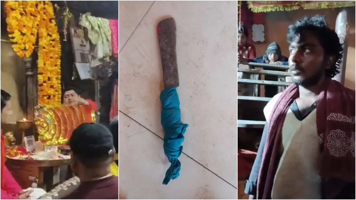 दरोगा ने युवक के झोले से धारदार बांका बरामद किया है। पूछताछ में युवक ने मन्नत पूरी होने पर खुद की बलि देने की बात कही है। इसके बाद मंदिर परिसर में हड़कंप मच गया। युवक के परिजन ने उसे मानसिक रूप से बीमार बताया है।