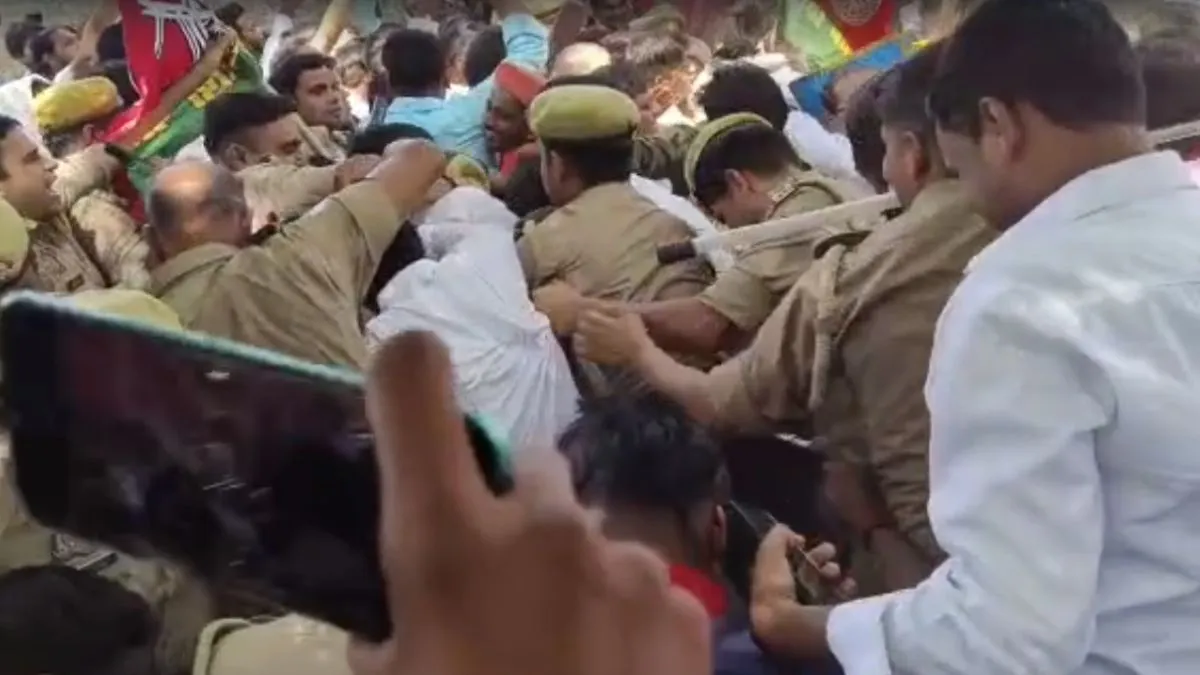 अखिलेश के पहुंचते ही जब भगदड़ मच गई तो सपा कार्यकर्ताओं को अंदर जाने से रोकने में पुलिस के पसीने छूट गए। इसके बाद कार्यकर्ताओं ने फिर से नारेबाजी शुरू कर दी। जो वीडियो सामने आया है उसमें साफ दिख रहा है कि कैसे अखिलेश की गाड़ी आते ही कार्यकर्ता बेकाबू हो गए और वहां मौजूद पुलिसकर्मी भीड़ के आगे कम पड़ गए।