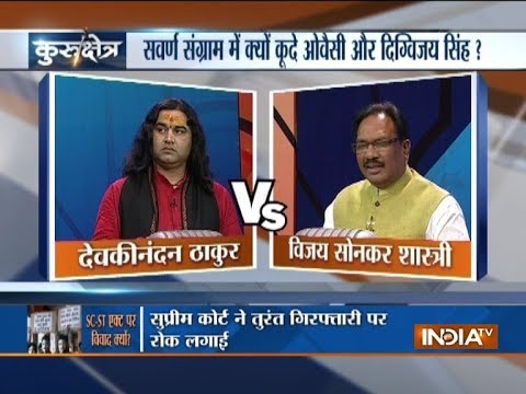 इंडिया टीवी के खास कार्यक्रम कुरुक्षेत्र में 'एससी/एसटी ऐक्ट और सवर्णों के प्रदर्शन पर' कथा वाचक एवं सवर्ण आंदोलन के नेता देवकीनंदन ठाकुर और भाजपा प्रवक्ता विजय सोनकर शास्त्री के बीच बड़ी बहस