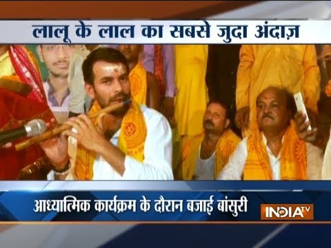 बिहार में पलथी मारकर लालू के बेटे तेज प्रताप ने बजायी बांसुरी, लोग हुए मंत्रमुग्ध