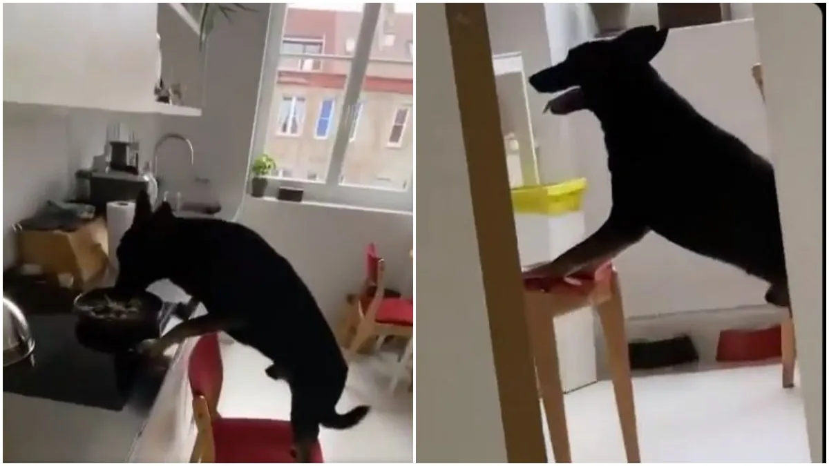 वायरल हो रहे इस वीडियो में एक काला डॉगी नजर आ रहा है। ये कुर्सी को अपने दो पैरों से खींचकर किचन की तरफ ले जाता है। डॉगी की इस हरकत को उसका मालिक रिकॉर्ड कर रहा होता है, पर डॉगी इस बात से अंजान था। इसलिए ये डॉगी बड़े ही आराम से किचन की ओर बढ़ रहा था। उसके बाद फिर वे खुशी-खुशी ऊपर चढ़ गया और खाना खाने लगा। कुछ देर बाद जब मालिक किचन में गया तो देखा कि डॉगी उसी कुर्सी के उपर अपने पिछले पैरों पर खड़े होकर मजे से खाना खा रहा था।