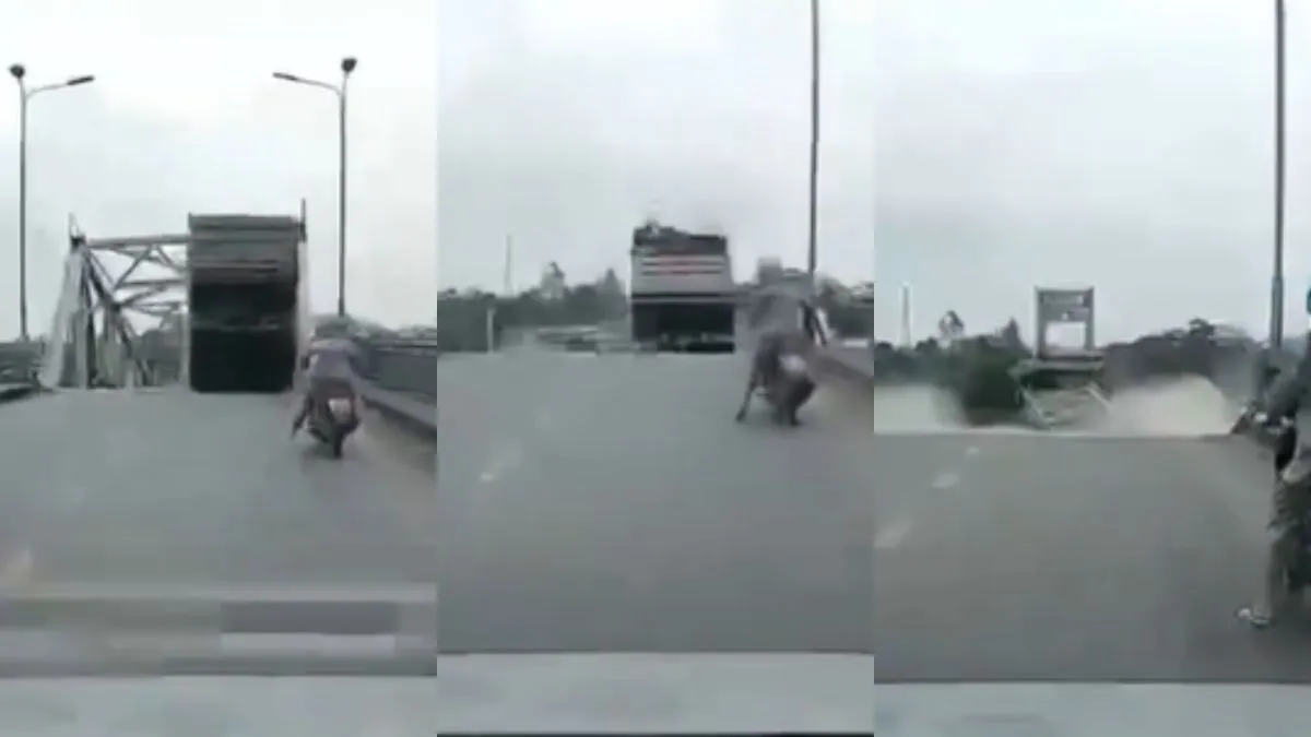 एक वाहन के डैश कैम में ऐसा नजारा कैद हुआ जिसे देखने के बाद आप हैरान हो जाएंगे। वायरल हो रहे वीडियो में नजर आ रहा है कि एक ट्रक सड़क पर चलते हुए जा रहा है। तभी एक पुल आता है जिसे पार करने के लिए ट्रक का ड्राइवर उसपर चढ़ता है मगर जैसे ही ट्रक पुल के पास पहुंचता है, वो पुल ताश के पत्तों की तरह गिर जात है और इसके चपेट में ट्रक के साथ कई अन्य गाड़ियां भी आ जाती हैं। इस हादसे को देखते हुए दूसरे सभी वाहन चालक अपनी बाइक और कार को रोक लेते हैं और वहां से वापस जाने लगते हैं।