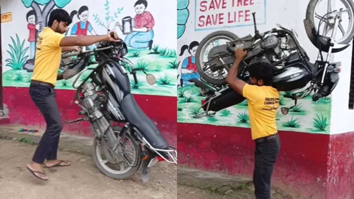 अभी जो वीडियो वायरल हो रहा उसमें नजर आ रहा है कि एक स्कूल के पास एक मोटरसाइकिल खड़ी है। तभी एक शख्स वहां आता है और बाइक के आगे वाले पहिए को हवा में उठाते हुए बाइक को खड़ा कर देता है। इसके बाद वह बाइक के पीछे आता है और अपना पॉजीशन बनाते हुए कंधे को सीट के बराबर ले जाता है। उसके बाद शख्स उस बाइक उठाने की कोशिश करने लगता है। थोड़ी सी मेहनत करने के बाद वह आदमी बाइक को अपने कंधे पर उठा लेता है और उसे वैसे ही उठाए हुए वहां से चल देता है। यह वीडियो सोशल मीडिया पर काफी वायरल हो रहा है। शख्स ने बाइक को कंधे पर ऐसे उठाया जैसे वह एक तकिए को कंधे पर रख रहा है।