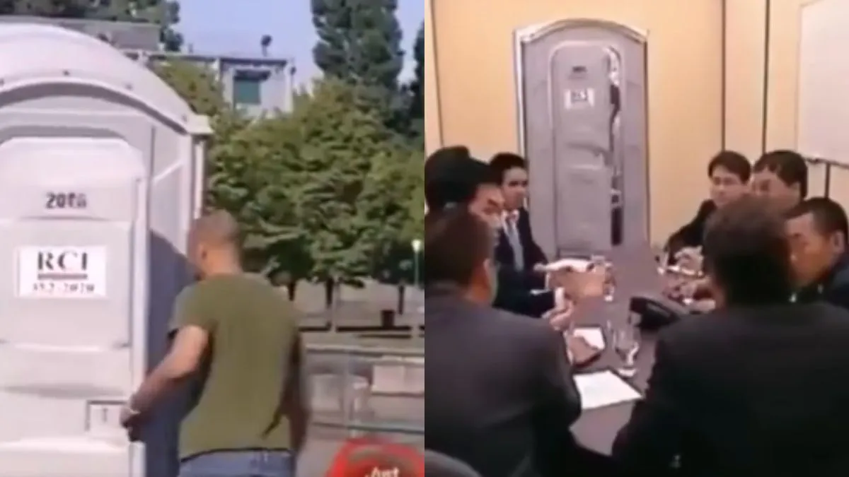 प्रैंक का जो वीडियो वायरल हो रहा है, उसमें आप देख सकते हैं कि एक शख्स पब्लिक टॉयलेट के अंदर जाता है। अब वहां मौजूद कुछ लोग उस शख्स के जाने का इंतजार कर रहे होते हैं। जैसे ही वो शख्स अंदर चला जाता है, बाहर इंतजार कर रहे लोग वहां एक 'सेटअप' लगा देते हैं। ये पूरा सेटअप पहले से ही तैयार था, बस इसे वहां लगाना बाकी था। कुछ देर बाद जब वह शख्स टॉयलेट से बाहर निकलता है, वह हैरान हो जाता है। वह इंसान देखता है कि वो एक कॉन्फ्रेंस रूम में आ गया है, जहां कुछ लोग बैठ कर आपस में बातचीत कर रहे हैं। ये सब देख उस शख्स को कुछ भी समझ में नहीं आता है और वो टॉयलेट में वापस चला जाता है।