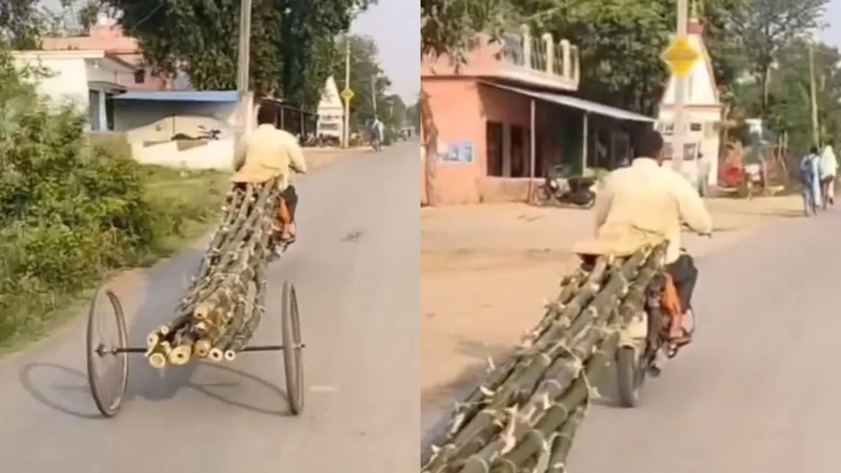 अभी जो वीडियो वायरल हो रहा है उसमें नजर आ रहा है कि एक शख्स कुछ बांस को एक साथ बांधकर ले जा रहा है मगर इस काम के लिए उसने किसी कार्ट का सहारा नहीं लिया बल्कि उसने जुगाड़ का इस्तेमाल किया। दरअसल उसने सभी बांसों को एक साथ बांध लिया और फिर एक छोर को अपने बाइक पर रखकर अच्छे से बांध दिया। इसके बाद दूसरे छोर के नीचे किसी कार्ट का सिर्फ पहिया लगाया और उसे पर उसे बांध दिया। मतलब दो पहियों के बीच डंडे पर उसने बांस को बांध दिया और इस तरह वो जुगाड़ से उन्हें ले जाते दिखा।