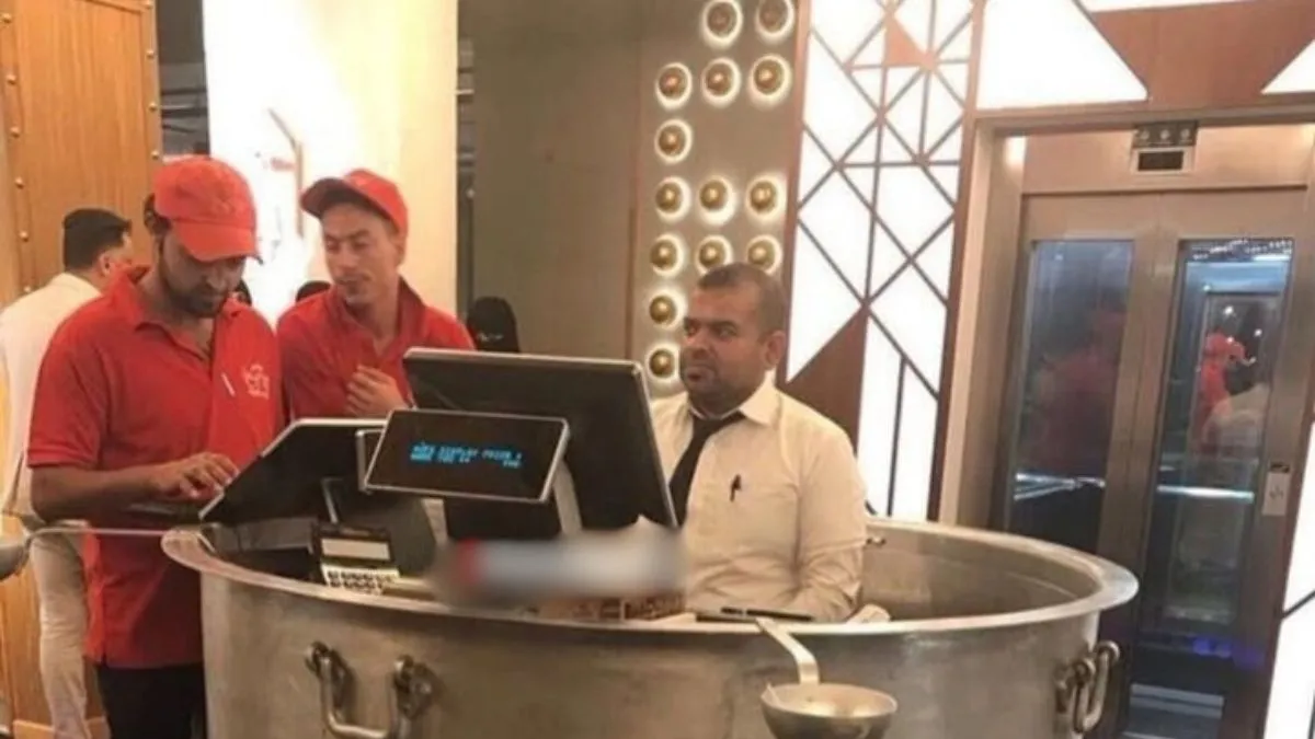 आप अब तक बड़े से बड़े रेस्टोरेंट में गए होंगे। आप कई फेमस ढाबे में भी गए होंगे और वहां जाकर आपने वहां का स्पेशल खाना भी खाया होगा। लेकिन अभी वायरल फोटो में जो दिख रहा है, वैसा कुछ कहीं भी नहीं देखा होगा। वायरल हो रहे फोटो में मैनेजर नजर आता है जो अपने सिस्टम के साथ बैठा हुआ है। मगर वो किसी टेबल और कुर्सी पर नहीं बैठा है। बल्कि वो जहां बैठा है, उसके चारों तरफ एक बड़ा सा भगोना जैसा बर्तन नजर आ रहा है। वो उसके बीच में बैठा हुआ है और यही कारण है कि फोटो वायरल हो रही है।