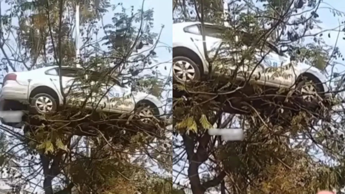 आपने एक्सीडेंट के कई वीडियो या फिर सामने ही एक्सीडेंट होते हुए देखा होगा। एक्सीडेंट के बाद बाइक या कार अलग-अलग हालत में आपको नजर आई होगी मगर शायद ही कभी कोई ऐसा एक्सीडेंट देखा होगा जिसके बाद कार सीधे पेड़ के ऊपर नजर आई हो। अभी वीडियो वायरल हो रहा है उसमें नजर आता है कि एक पेड़ के ऊपर कार खड़ी है। यह देखकर यह समझ में नहीं आ रहा है कि ऐसा हुआ तो हुआ कैसे। वायरल वीडियो कब और कहां का है, इसकी जानकारी नहीं दी गई है।