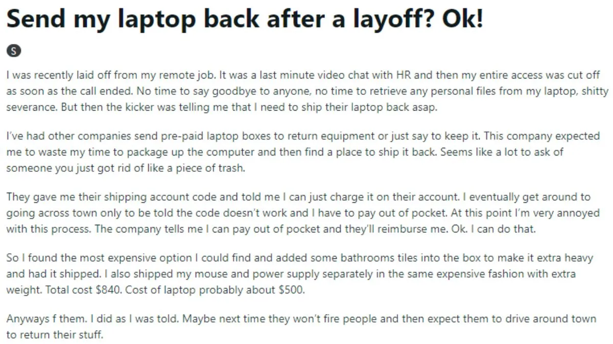 बंदे ने आगे लिखते हुए बताया कि, 'कंपनी ने मुझे शिपिंग कोड दिया जो शहर में कहीं काम ही नहीं कर रहा था। इस वजह से मुझे कई जगह घूमना पड़ा। उनका लैपटॉप कुरियर करने के लिए मुझे अपनी जेब से भुगतान करना पड़ा। हालांकि कंपनी ने कहा कि मुझे यह पैसा वापस मिल जाएगा। इसलिए मैंने उस बॉक्स में बाथरूम के टाइल्स भर कर उसका वजन बढ़ा दिया और भेज दिया। इतना ही नहीं मैंने माउस और अन्य चीजों को दूसरे डिब्बे में भेजा और ऐसा ही उसका भी वजन बढ़ाया। इस तरह लगभग $500(41,610 रुपये) के लैपटॉप उन्हें $840(69,905 रुपये) का पड़ा। मुझे अब लगता है कि आगे से वो किसी को ऐसे नौकरी से नहीं निकालेंगे।'
