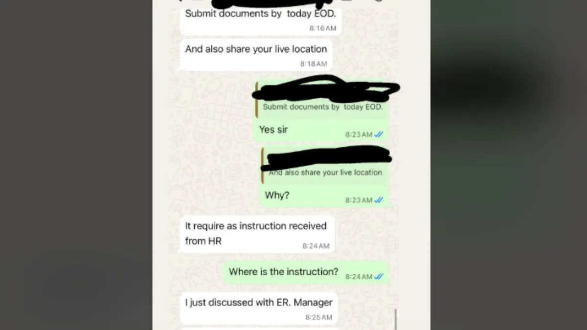 इस पोस्ट को रेडिट पर शेयर किया गया है। पोस्ट को @Capital_Option_7780 नामक हैंडल से शेयर किया गया है। "क्या लाइव लोकेशन मांगना ठीक है?" शीर्षक वाले एक वायरल रेडिट पोस्ट में, कर्मचारी ने बॉस के साथ हुई व्हाट्सएप बातचीत का स्क्रीनशॉट साझा किया है ?? जिसमें बॉस ने दावा किया है कि कर्मचारियों की लाइव लोकेशन देखना HR Policy का हिस्सा है। यूजर ने लिखा, 'कल मुझे तेज सिरदर्द के कारण छुट्टी लेनी पड़ी थी। आज सुबह मैंने अपने बॉस से दोबारा छुट्टी देने का अनुरोध किया क्योंकि मुझे अभी भी सिरदर्द हो रहा था। उन्होंने मुझे HR विभाग से बात करने को कहा, और HR विभाग ने वैध दस्तावेज देने को कहा। मैंने यह बात अपने बॉस को बताई। उन्होंने मुझसे लाइव लोकेशन शेयर करने को कहा। मुझे पता है कि यह ठीक नहीं है। इसके क्या परिणाम होंगे?' व्हाट्सएप चैट में, बॉस ने पहले कर्मचारी को दिन के अंत तक दस्तावेज जमा करने का आदेश दिया और फिर लाइव लोकेशन की जानकारी मांगी। जब कर्मचारी ने पूछा कि ऐसी जानकारी क्यों आवश्यक है, तो बॉस ने जवाब दिया: 'यह मानव संसाधन विभाग से मिले निर्देश के अनुसार आवश्यक है।'