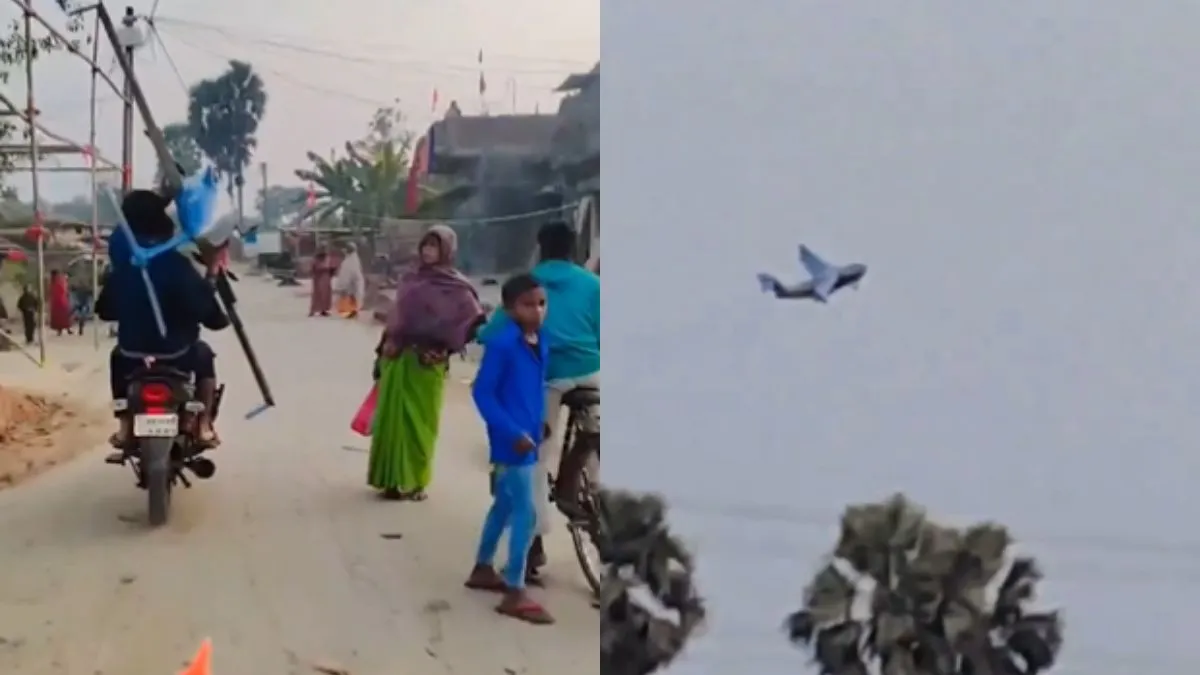 वायरल हो रहे इस वीडियो में कुछ लड़के एक बाइक पर प्लेन को हाथ में लिए कहीं जा रहे हैं। उनके हाथ में जहाज देख आस-पास के लोग दंग रह गए। जिन्होंने भी उन्हें प्लेन के साथ देखा वह देखते रह गए। कुछ देर बाद वह एक जगह पहुंचकर बाइक से उतरते हैं और उस जहाज को रनवे पर रिमोट से दौड़ाते हैं। देखते ही देखते प्लेन आसमान में उड़ने लगता है। कुछ दूर तक आसमान में चक्कर लगाने के बाद प्लेन को वापस नीचे लैंड कराया जाता है। इस नजारे को देखने के लिए पूरे गांव के लोग इकट्ठा हो जाते हैं।