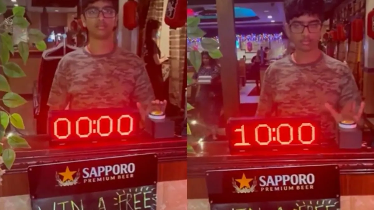 सोशल मीडिया पर वायरल हो रहे वीडियो को जब आप ध्यान से देखेंगे तो पाएंगे कि एक बोर्ड पर लिखा है कि, 'आप एक फ्री ड्रिंक जीत सकते हैं। क्या आप यह कर सकते हैं। इस लाइन के आगे 10:00 का नंबर लिखा है।' आपको उस बोर्ड के ऊपर एक टाइमर भी रखा हुआ नजर आएगा। आपको बता दें कि इस तरह के टास्क में शख्स को दिए गए समय पर टाइमर को रोकना होता है। यह काफी मुश्किल टास्क होता है क्यों दिए गए समय पर टाइमर रोकना बहुत मुश्किल होता है। अधिकतर लोग 1-2 सेकंड जल्दी या फिर देरी से टाइमर को रोक पाते हैं। वीडियो में शख्स को 10 सेकंड के समय पर टाइमर को रोकना है और अगर वह ऐसा कर देता है तो उसे एक ड्रिंक फ्री में मिलेगी। वीडियो देखेंगे तो आपको पता चलेगा कि शख्स ने बड़ी ही आसानी से इस टास्क को पूरा कर दिया।