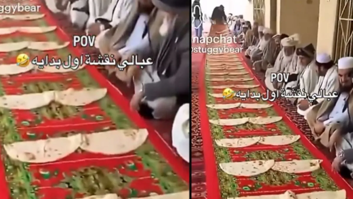 इस वीडियो को एक्स पर @Kanikabeniwal09 नामक हैंडल से शेयर किया गया है। वीडियो के कैप्शन में लिखा है कि, 'वाह क्या निंजा टेक्निक है खाना परोसने की सबको एक साथ। अब बार बार खाना लाने की टेंशन खत्म।' इस वीडियो को अब तक लगभग 1 लाख 90 हजार से ज्यादा लोगों ने देखा है। वीडियो देखने में किसी अरब देश का लग रहा है क्योंकि, लाइन में कई मुस्लिम समुदाय के लोग बैठे हैं। हालांकि, इंडिया टीवी इस दावे की पुष्टि नहीं करता है। वीडियो में आप देख सकते हैं कि लाइन में बैठे सभी लोगों के सामने एक चादर रखी गई है। उस पर रोटियों को इस तरह से रखा गया उन्हें आसानी से उठाया जा सके। इसके बाद चादर के दूसरे छोर पर खड़ा शख्स धीरे—धीरे चादर खींचता है और इससे सबके पास रोटियां पहुंच जाती हैं।