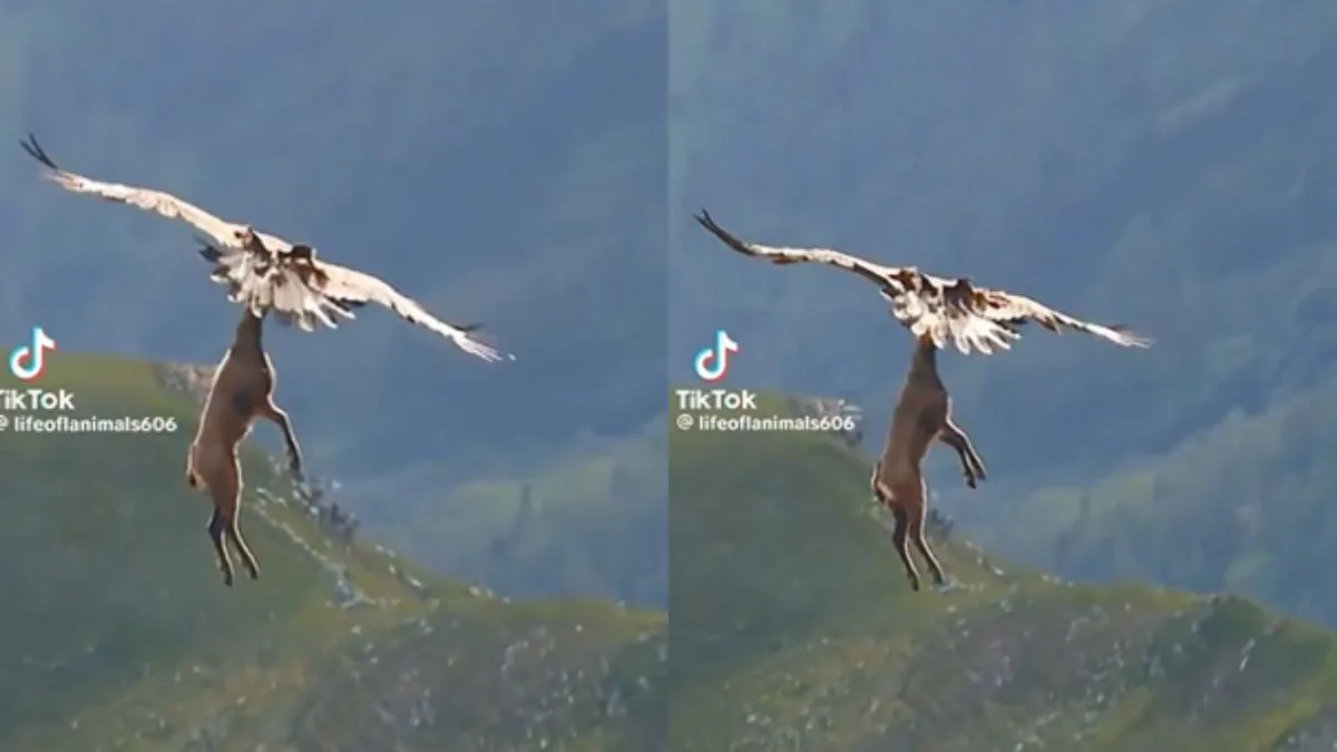 गोल्डन ईगल अक्सर पहाड़ों में पाए जाते हैं और वो बेहद ताकतवर होते हैं। वो दूर से शिकार को भांपते हैं और पल भर में उसका काम तमाम कर देते हैं। वायरल हो रहे वीडियो में आप देखेंगे कि गोल्डन ईगल ने हिरण को दबोच रखा है और आसमान में हिरण नजर आ रहा है। वीडियो में चारों तरफ सिर्फ पहाड़ नजर आ रहा है। यह वीडियो सोशल मीडिया पर वायरल हो रहा है। इस वीडियो को महज दो दिनों में 88 मिलियन व्यूज मिल चुके हैं। यूजर्स इस पर कॉमेंट भी खूब कर रहे हैं। इस वीडियो को X के @BiffDon पर शेयर किया गया है। एक यूजर ने कॉमेंट किया है- हिरण के शरीर के साथ हाइब्रीड ईगल नजर आ रहा है।