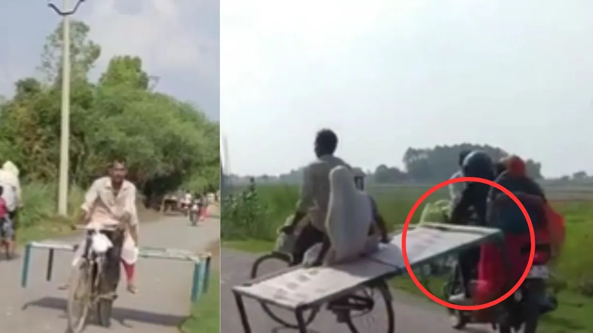 सोशल मीडिया पर एक वीडियो खूब वायरल हो रहा है। इस वीडियो को देखने के बाद आप हैरान रह जाएंगे। वीडियो में साफ देखा जा सकता है कि एक युवक ने चारपाई साइकिल के कैरियर पर रख दी है। इसमें सबसे हैरान करने वाली बात तो यह है कि चारपाई पर एक बूढ़ी औरत बैठी नजर आ रही है। बुढ़ी औरत भी उस पर बेखौफ बैठी हैं। वहीं दूसरी ओर साइकिल सवार शख्स मौज में साइकिल चला रहा है, तभी वह एक बड़े हादसे का शिकार होने से बच जाता है। आप वीडियो में देख सकते हैं कि वह सड़क पर जा रहा होता है तभी वहां से एक मोटरसाइकिल गुजर रही है। इसी दौरान साइकिल मोटरसाइकिल से टकरा जाती है। इसके बाद साइकिल सवार युवक असंतुलित हो जाता है। हालांकि कोई बड़ी घटना नहीं होती है।