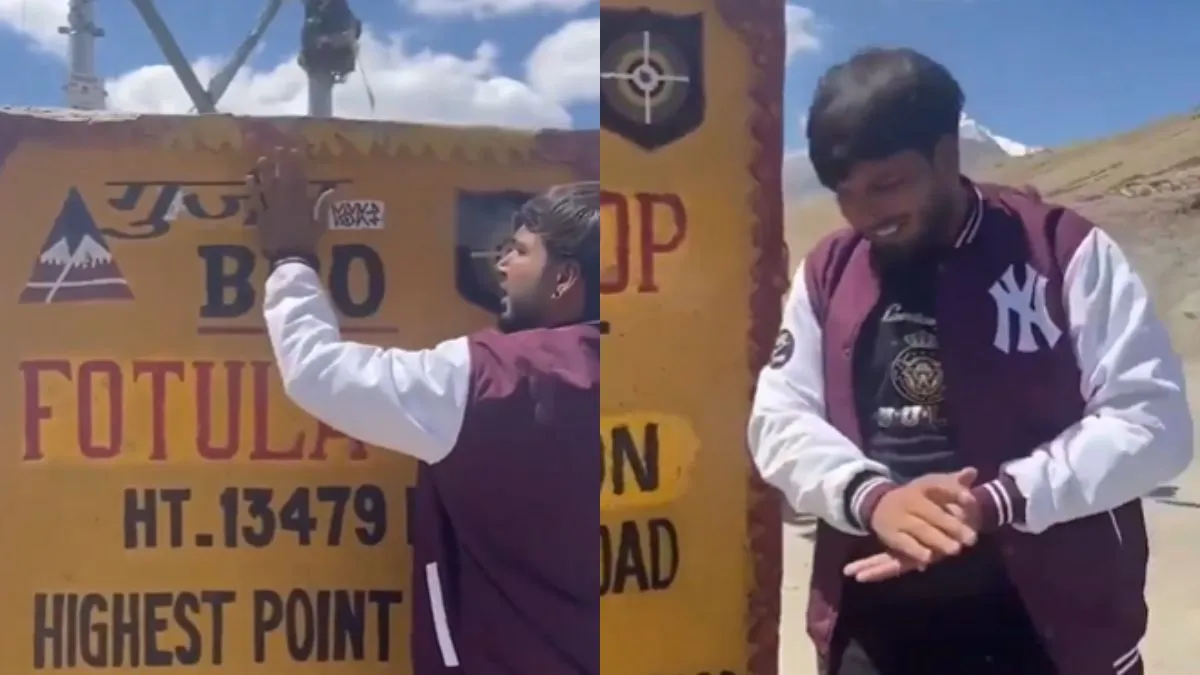 अभी जो वीडियो वायरल हो रहा है वो वैसे तो सिर्फ 10 सेकंड का है मगर वीडियो में जो दिखा, उसे देखने के बाद लोग उसे ट्रोल कर रहे हैं। वीडियो में दिखता है कि एक बंदा 13,479 फीट ऊंचाई पर है जहां BRO का एक बोर्ड लगा हुआ है। अब उस बोर्ड पर एक बंदे ने 'गुर्जर' का स्टीकर चिपकाया हुआ है और उस पर हाथ फेरते हुए नजर आ रहा है। अब यह समझ में नहीं आता है कि वायरल होने के लिए ऐसा कुछ करने की उसे क्या ही जरूरत थी। अब वो इसका नतीजा भी भुगत रहा है। सोशल मीडिया पर जमकर ट्रोल हो रहा है।