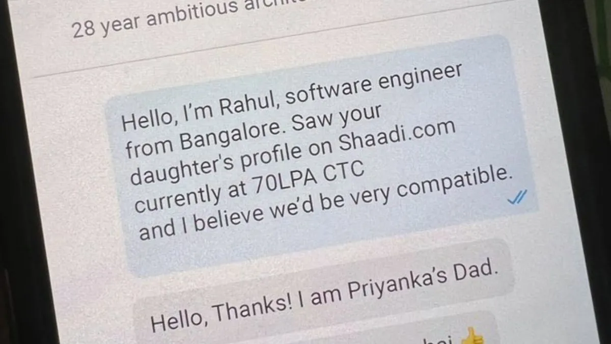 कल यानी 27 जून 2024 को भारत और इंग्लैंड के बीच सेमीफाइनल का मैच खेला गया जिसमें भारत में मैच को जीत लिया और फाइनल में पहुंच गई। इस फोटो को उसी मैच के दौरान हुई बातचीत का माना जा रहा है। दरअसल एक लड़के ने प्रियंका नाम की लड़की के पिता से अपने रिश्ते की बात शुरू की। उसने मैसेज करते हुए लिखा, 'हेलो, मेरा नाम राहुल है, मैं बेंगलुरु में सॉफ्टवेयर इंजीनियर हूं। मैंने शादी डॉट कॉम पर आपकी बेटी का प्रोफाइल देखा। अभी मेरी CTC 70LPA है औ मुझे लगता है कि हम एक दूसरे के लिए सही होंगे।' इस मैसेज को देखने के बाद प्रियंका के पापा ने थैंक्स लिखते हुए अपना रिप्लाई दिया। उन्होंने लिखा, 'मैच के बाद बात करता हूं।' अब यह फोटो लड़के ने शेयर किया जो वायरल हो रही है।