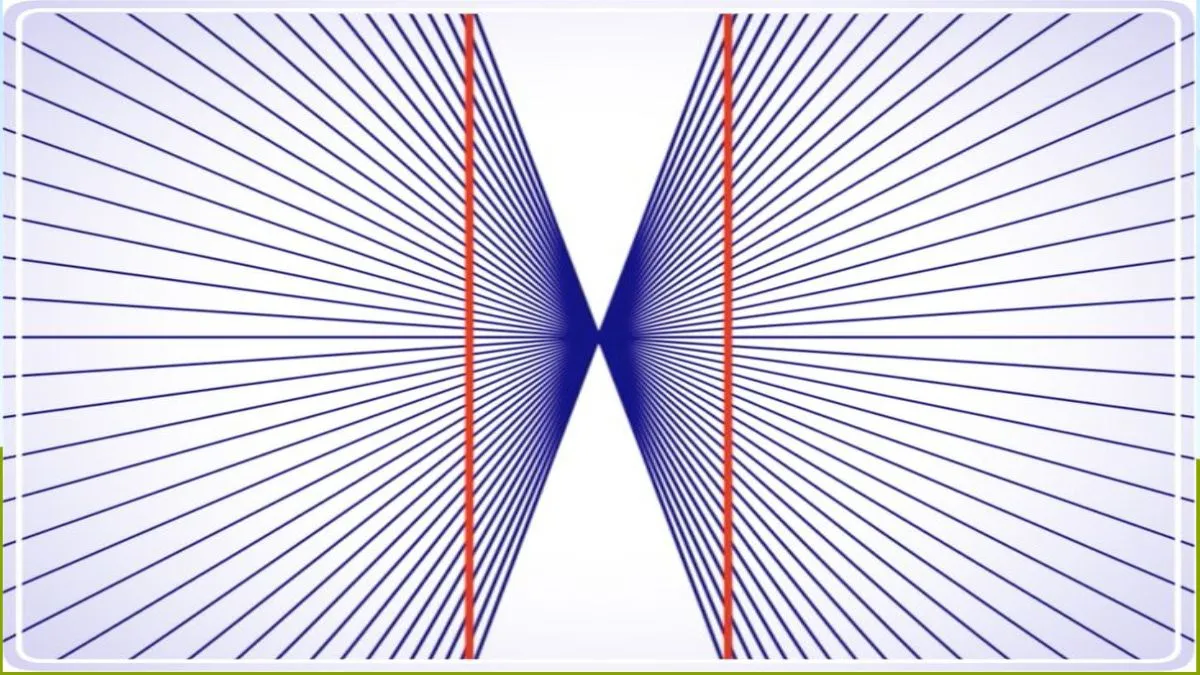 यदि आपको इसका उत्तर मिल गया तो सही बात है। अगर नहीं मिला है तो चलिए हम आपको इसका उत्तर बता देते हैं। जैसा कि आप तस्वीर में देख रहे हैं कि बाएं और दाएं दोनों तरफ से बहुत सारी नीली रेखाएं खींची गईं हैं जो कि एक बिंदु पर जाकर मिल रही हैं। उसके ऊपर दो लाल रंग की रेखाएं सीधी खींची गईं है। अब आपको यही बताना था कि ये रेखाएं सीधी हैं या टेढ़ी? लगभग सभी ने यही उत्तर दिया था कि ये दोनों रेखाएं टेढ़ी हैं। देखने में भी ये टेढ़ी ही लग रही हैं। लेकिन आपको बता दें कि खींची हुई दोनों लाल लाइन बिल्कुल सीधी हैं और दोनों एक दूसरे के समानांतर हैं। यकीन न हो तो स्केल से मिलाकर देख लीजिए।