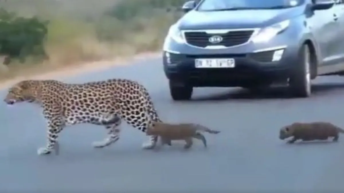 बीच सड़क पर मां को परेशान करने लगे तेंदुए के बच्चे