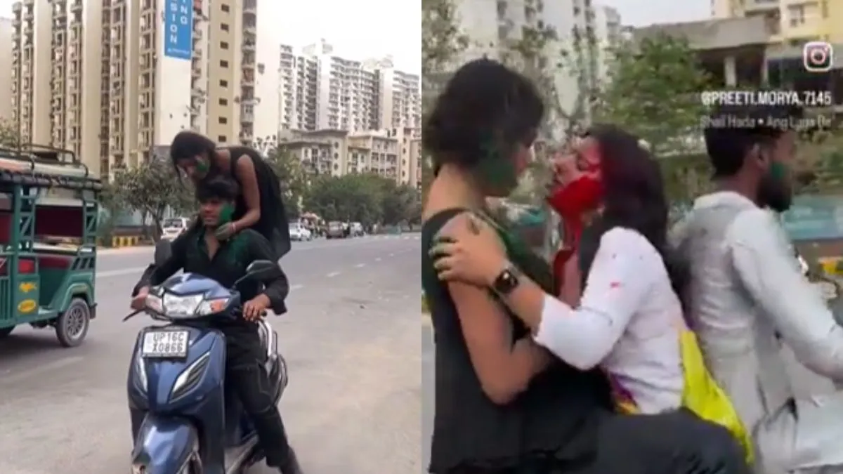 अभी पिछले कुछ दिनों से आप सोशल मीडिया पर देख रहे होंगे कि दो वीडियो काफी वायरल हो रहे हैं। एक वीडियो में नजर आता है कि एक लड़का स्कूटी चला रहा है। वहीं पीछे वाली सीट पर एक लड़की खड़ी होकर उसे रंग लगा रही है। दूसरे वीडियो में नजर आता है कि वही लड़का स्कूटी चला रहा है और पीछे दो लड़कियां बैठी हैं जो अश्लीलता से एक दूसरे को रंग लगा रही हैं। एक वीडियो को लोगों ने अश्लील बताया तो वहीं दूसरे वीडियो को देखने के बाद लोगों ने इसे दूसरों के लिए खतरनाक बताया। वीडियो इतना वायरल हुआ कि अब नोएडा पुलिस ने अब मामले में कार्रवाई भी की है।