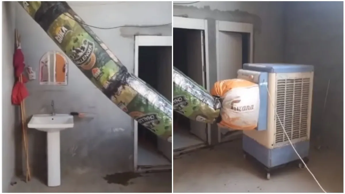 वायरल हो रहे वीडियो में देखा जा सकता है कि बोरियों की मदद से हवा को कमरे में भेजा जा रहा है। जब कूलर चलता तो इसकी हवा इधर-उधर भागती है। इसे एक जगह करने के लिए ये बोरियों का देसी जुगाड़ बैठाया गया है। ये वीडियो देखकर आप अपनी हंसी नहीं रोक पाएंगे साथ ही इस जुगाडू इंसान की तारीफ करेंगे।