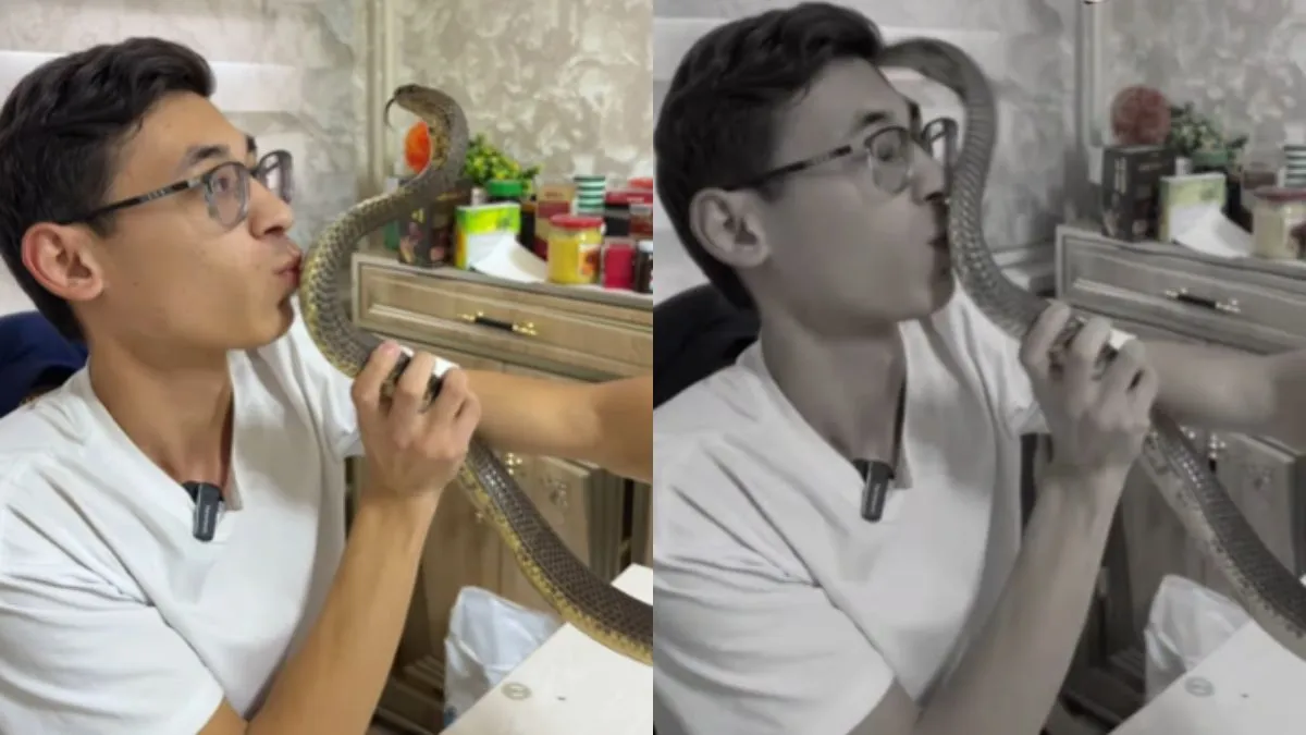 वीडियो में देखा जा सकता है कि शख्स अपने हाथ में जहरीला कोबरा सांप को पकड़े हुए कैमरे के सामने बातें कर रहा है। बात करते-करते वह शख्स अचानक से उस कोबरा सांप को चूमने लगता है। जिससे किग कोबरा को गुस्सा आ जाता है और बदले में वह शख्स पर अटैक करते हुए उसके माथे पर काट लेता है। वीडियो के कमेंट सेक्शन में यह जानकारी दी गई है कि यह वीडियो उज्बेकिस्तान का है और जिस शख्स के माथे पर सांप ने काटा था, वह बिल्कुल सुरक्षित है।
