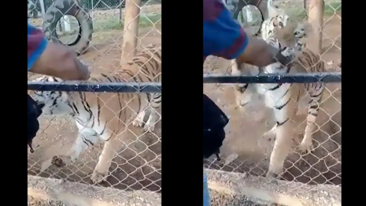 आजकल सोशल मीडिया पर एक वीडियो काफी शेयर किया जा रहा है। वीडियो में आप देखेंगे कि एक शख्स, बाघ को छूने का प्रयास कर रहा है। मगर बाघ को देखकर ऐसा लगता है कि वो कुछ खाने का सामान ढूंढ रहा है। शख्स के हाथों में कुछ नहीं मिलता है तो बाघ वहां चला जाता है। बाघ थोड़ी देर में वापस आता है और शख्स के बैग को खींचने का प्रयास करता है। इसी बीच वो शख्स अपना हाथ बाघ के पिंजरे में डाल देता है और बाघ को सहलाने की कोशिश करता है। इस बात पर बाघ को गुस्सा आ जाता है और वो शख्स के हाथ को अपने जबड़ों में पकड़ लेता है। शख्स अपने हाथों को छुड़ाने का बहुत प्रयास कर रहा होता है मगर ये उसके लिए आसान नहीं होता है। वीडियो यहीं पर खत्म हो जाता है।
