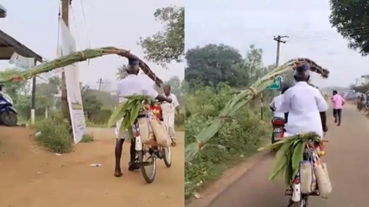 सोशल मीडिया पर एक वीडियो तेजी से वायरल हो रहा है। जिसमें एक बुजु्र्ग पिता पोंगल के अवसर पर अपने सिर पर गन्ने का गट्ठर रख 14 किलोमीटर साइकिल चलाकर अपनी बेटी के घर उपहार लेकर पहुंचा। मामला तमिलनाडु के पुदुक्कोट्टई का है। फिलहाल इस बुजुर्ग पिता का वीडियो देख सभी लोग हैरान हैं। अपनी संस्कृति को बयां करता ये वीडियो ने सबकी आंखों में आंसू ला दिया। वीडियो को देखने के बाद कुछ लोग बुजुर्ग की तारीफ कर रहे तो कई लोग उनके इस कमाल के बैलेंस को देख हैरान हो गए।