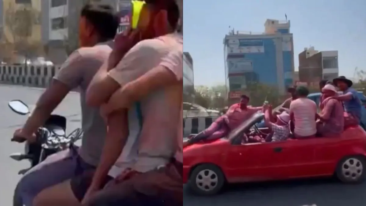 कल यानी 25 मार्च 2024 को पूरे देश में होली का त्योहार मनाया गया है। रंगों के इस त्योहार को पूरे देश में बड़े ही हर्षोल्लास और धूमधाम के साथ मनाया गया। चारों तरफ लोग एक दूसरे को रंग लगाते और मौज-मस्ती करते हुए नजर आए। होली खेलते हुए लोगों के कई वीडियो भी सोशल मीडिया पर वायरल हुए। मगर इसी दौरान कई लोग ऐसे भी थे जिन्होंने त्योहार के नाम पर ट्रैफिक के नियम को तोड़ा। ऐसा एक वीडियो भी सोशल मीडिया पर वायरल हो रहा है। आइए आपको बताते हैं कि वीडियो में ऐसा क्या नजर आ रहा है।