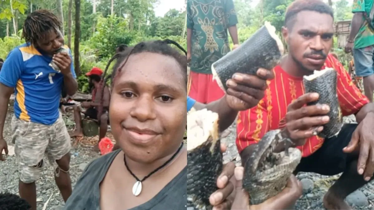 वायरल हो रहे इस वीडियो में कुछ ट्राइव्स को देखा जा सकता है जो जंगल में एक विशालकाय अजगर के दिखने के बाद उन्होंने उसे मार डाला और उसे काट-काट कर कच्चे ही खा गए। वीडियो को खुद ट्राइब की एक महिला ने बनाया है और शेयर किया है। वीडियो पापुआ न्यू गिनी का बताया जा रहा है। वीडियो में आप देख सकते हैं कि अजगर के दिखते ही लोगों ने झट से उसका शिकार कर उसके टुकड़े-टुकड़े कर डाले। जिसके बाद उन्होंने अजगर के मांस को अपने लोगों में बांट दिया। वीडियो देखने से यह पता चलता है कि अजगर के कच्चे मांस को लोगों ने जमकर एन्जॉय किया।