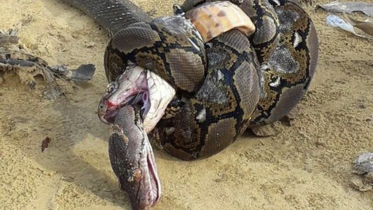 शेयर किए गए तस्वीर के अनुसार, अजगर और किंग कोबरा का भयानक लड़ाई हुई और दोनों ने एक दूसरे को बेहद दर्दनाक मौत दी। जहां अजगर ने किंग कोबरा को फांसकर उसका दम घोंट दिया तो वहीं, कोबरा ने अजगर के पूरे शरीर में जहर भर दिया। दोनों ने लड़ाई कर एक दूसरे को खत्म कर दिया। इस तस्वीर को ट्विटर पर IFS अधिकारी सुशांत नंदा (@susantananda3) ने शेयर किया और कैप्शन में लिखा- अजगर ने किंग कोबरा का दम घोंट दिया, जबकि कोबरा ने उसे काटकर अपने जहर से मार दिया। दोनों ही सांप मर गए, एक की मौत दम घुटने से हुई तो दूसरा जहर से मरा। ऐसे ही इंसान एक दूसरे को खत्म कर देता है। इतिहास गवाह है ऐसे पागलपन का...।