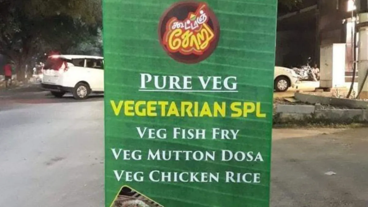 सोशल मीडिया पर एक फोटो वायरल हो रही है जिसे देखने के बाद आप भौचक्के हो जाएंगे। सोशल मीडिया पर एक होटल के बाहर लगाए गए बोर्ड की फोटो वायरल हो रही है। इस पर शुरु में तो 'Pure Veg और वेजिटेरियन स्पेशल' लिखा है। मगर उसके नीचे तीन अलग-अलग डिश के नाम लिखे गए हैं जो फोटो के वायरल होने का कारण है। बोर्ड पर 'वेज फिश फ्राई, वेज मटन डोसा, वेज चिकन राइस' लिखा हुआ है। इसे पढ़ने के बाद लोगों ने कमेंट सेक्शन को मजेदार कमेंट्स से भर दिया।