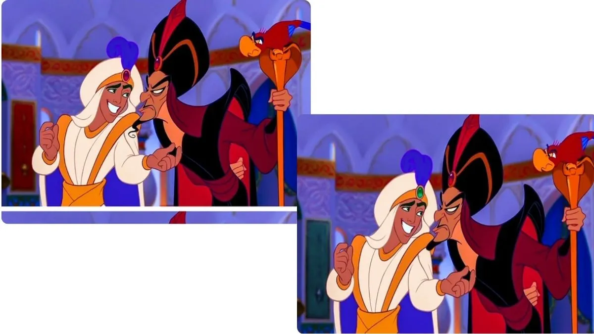 तस्वीर में डिज्नी की मशहूर फिल्म "अलादीन" के एक सीन में जफर और अलादीन की एक जैसी दो तस्वीरें हैं। तस्वीर में जफर अपनी जादुई छड़ी के साथ खड़ा है, जिसके ऊपर उसका प्यारा तोता इयागो बैठा है। सामने अलादीन, जो सुल्तान बनकर अपनी नई-नई सत्ता का मजा ले रहा है। भले ही ये तस्वीरें दिखने में सेम टू सेम लगे रहे हों लेकिन इनमें छोटे-छोटे 5 अंतर छुपे हुए हैं। जो आपकी नजरों को चकमा देने के लिए काफी हैं। इन्हें आपको मात्र 30 सेकेंड में खोजना है। तो, क्या आप तैयार हैं नजरों की इस जंग के लिए? अगर हां, तो चलिए शुरू करते हैं ये खेल! आपका टाइमर शुरू होता है अब।